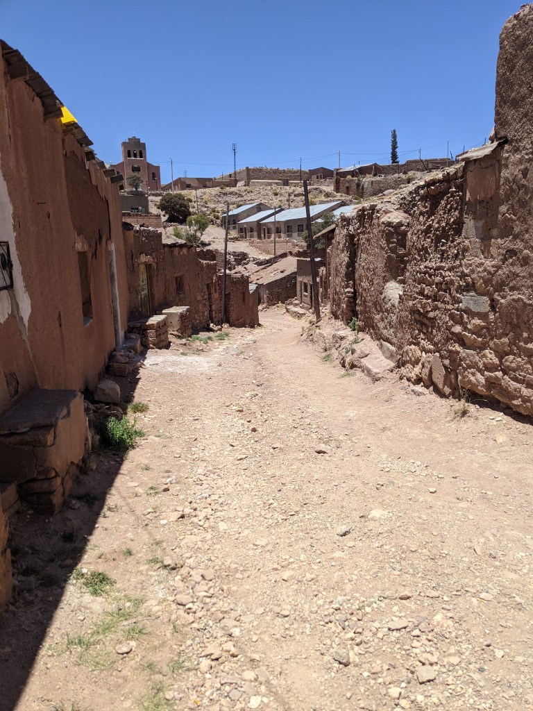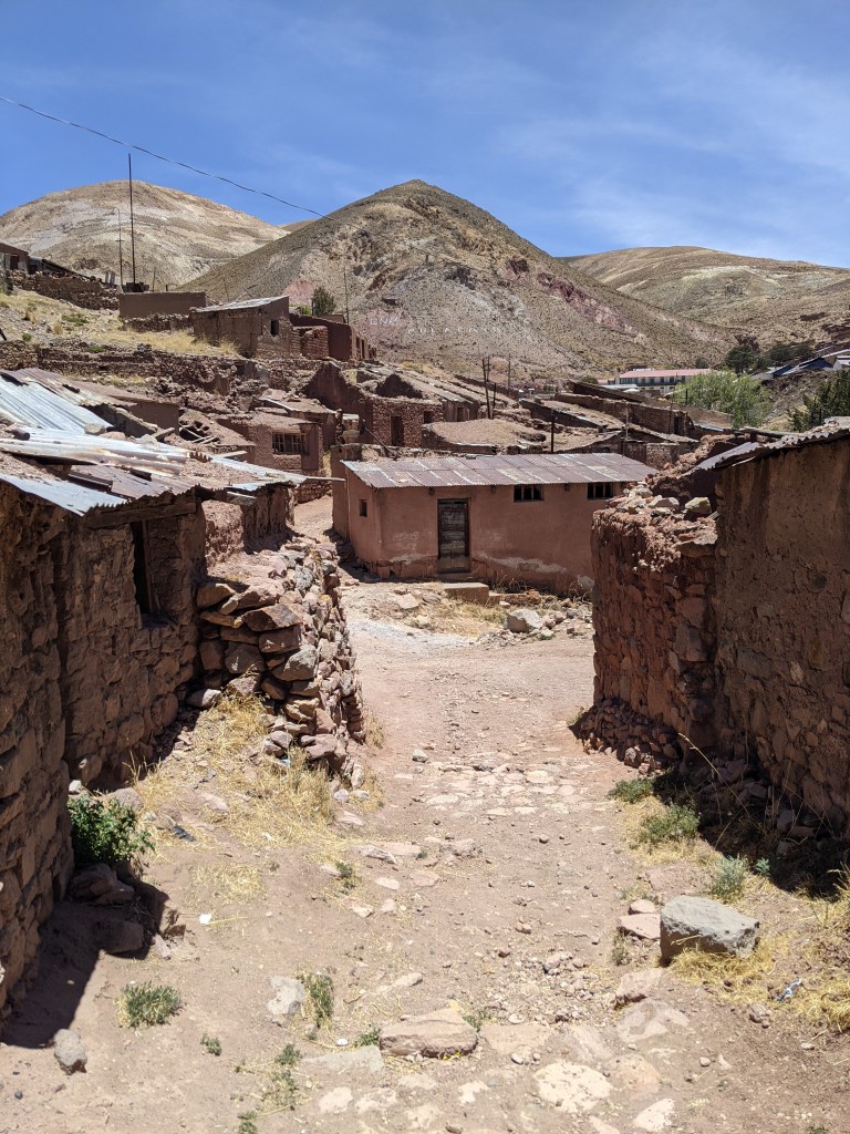 As I stumbled further down into the valley there were still signs of life echoing from within the buildings that hadn’t yet crumbled but the overarching vibe was an eery silence. An isolated, almost 4000m high silence. Very little life, the faint murmur of those stranded here and the swirl of the wind above. This eery scene was pierced by a megaphone and the revving of a lorry which had clearly just arrived to sell fruit and veg. From the hill above with ‘Pulacayo’ pebble-dashed into the side, all the way to the bottom of the valley where I stood, the man and his megaphone made an ear-splitting racket that made me yearn for the eery silence of before. It was unsettling but at least it was quiet.