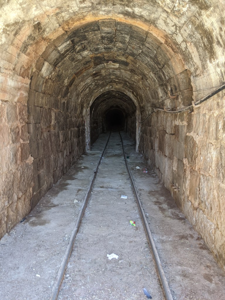 I didn’t know what to do. The museum was shut (my bad timing continues) and the man in charge was more interested in his lunch than this foreigner wanting to look around. He told me to come back in an hour but for some reason I didn’t believe him. I stumbled upon the entrance to the mine shaft, which was dotted by all the signs of 21st century industry. An ominous sign with all the boring health and safety notices, modern yellowy-orange hand carts for extracting mineral. Both of these suggested that the mine was or had reopened recently, but the complete lack of personnel and all the smashed windows in the buildings that flanked the entrance suggested otherwise. The rails curved off to the left around a ridge, with the old foundry sagging proudly next to it.